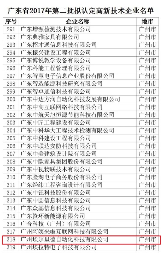 12月11日,根据《高新技术企业认定管理办法》(国科发火〔2016〕32号)和《高新技术企业认定管理工作指引》(国科发火〔2016〕195号)有关规定及相关公示,埃尔里德公司被拟认定为广东省2017年公布的第二批国家高新技术企业。通过国家高新技术企业认定,埃尔里德公司将获得国家一系列政策支持,为进一步提升企业的研发能力、市场竞争力、品牌建设增添了新动力。